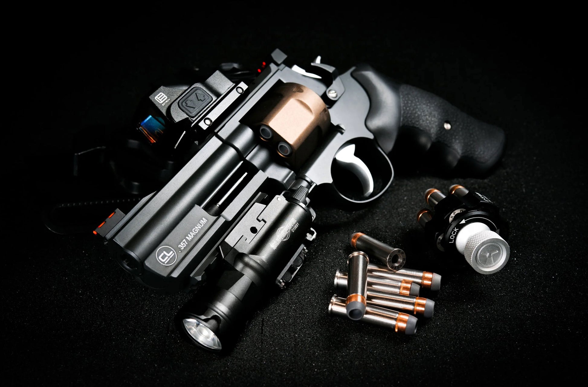 | - CL Project Design Custom-made Spring Set - Competition Ready L-Frame Revolver - Adjustable TDC Hop-up with One-Piece Barrel - Unique CL Swing-out 715 6-Chamber Hexagon Revolver Cylinder in Bronze - Black Finish w/ Bronze and Silver Accents - Quality Crafter Stainless Steel, Copper and Rubber .357 Shells - Extended Cylinder Thumb Release - Ergonomic Rubberised Grip w/ Finger Grooves - ARES Moonclip and Speed Loader Compatible - Alloy Construct |